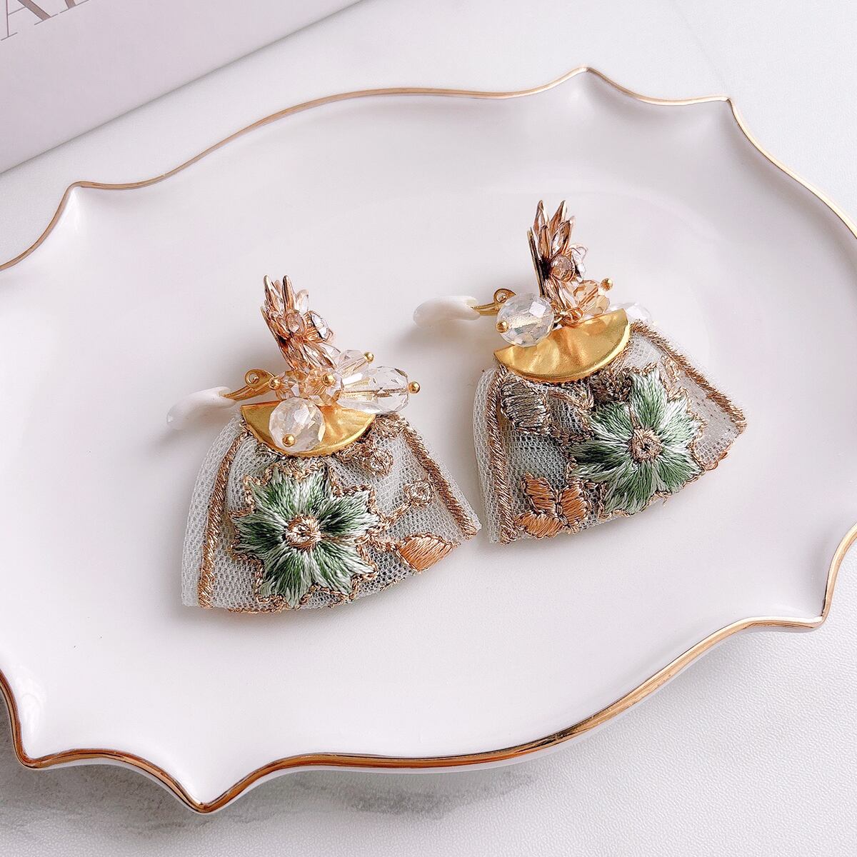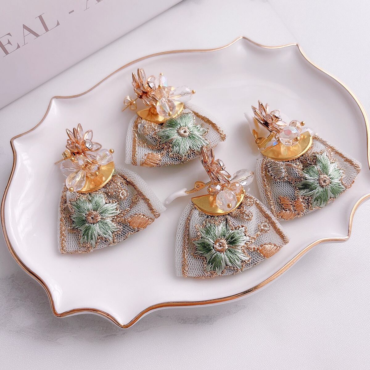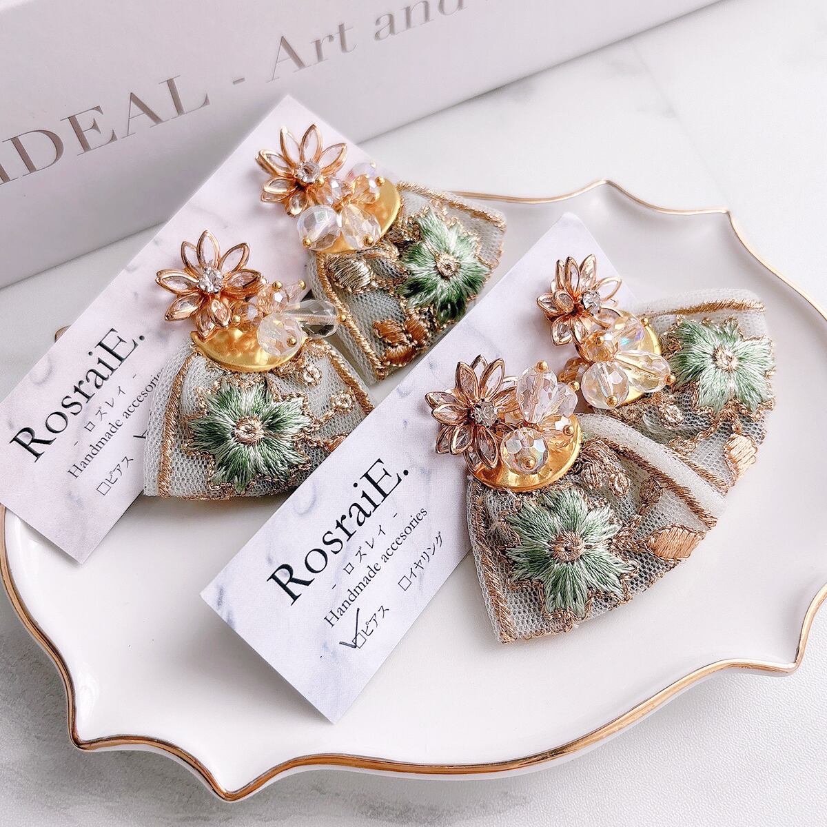 【suzuran】クリアフラワー&ビーズ グリーンインド刺繍リボン ピアス/イヤリング(ラスト1点ずつ)
