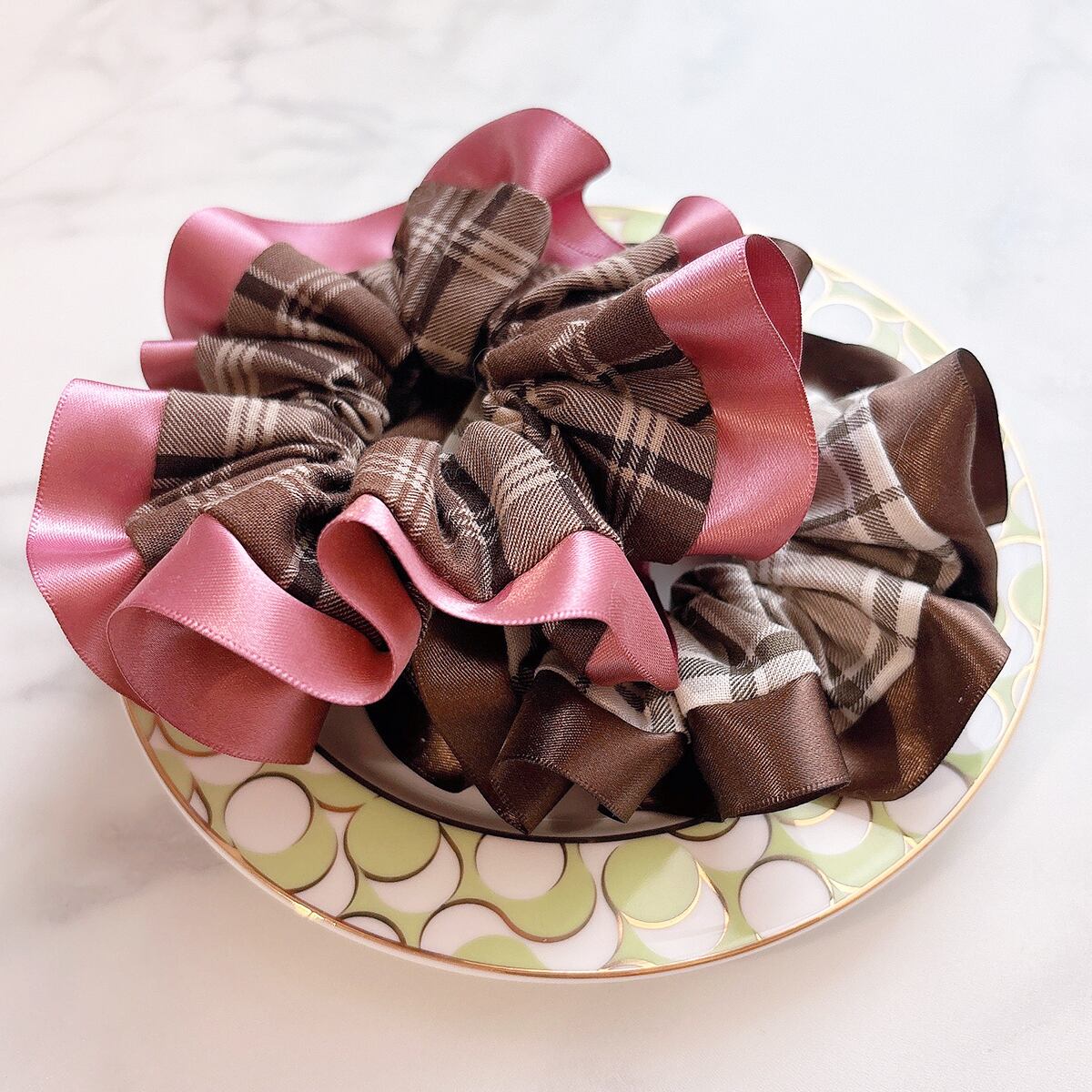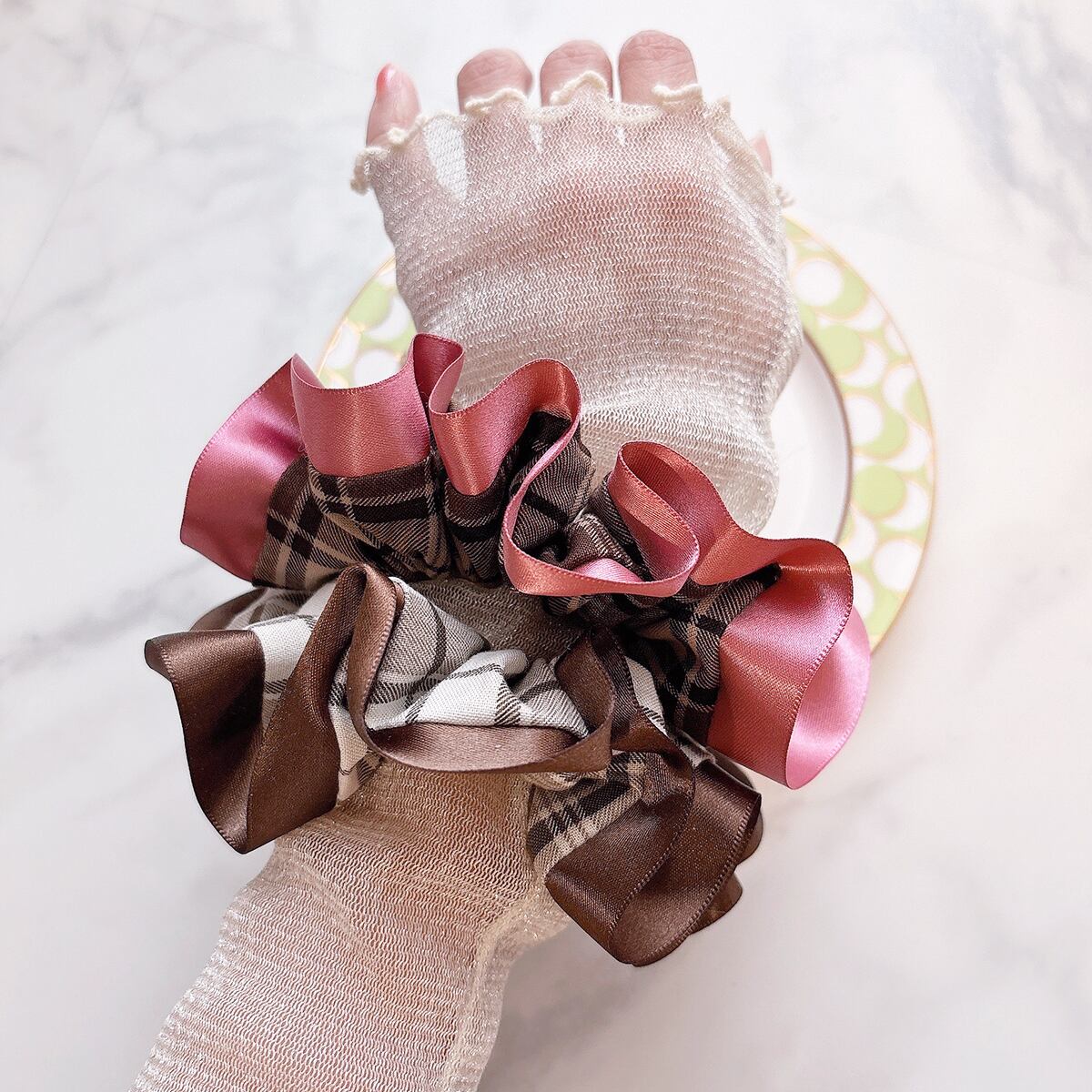 【ATELIER de BOUQUET】チェック柄サテンリボン付きシュシュ(ブラウン/アイボリー)