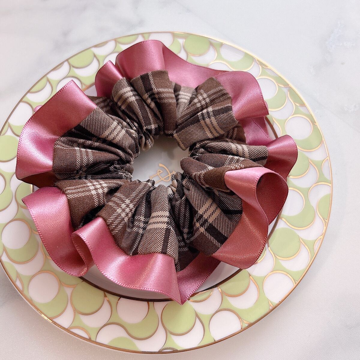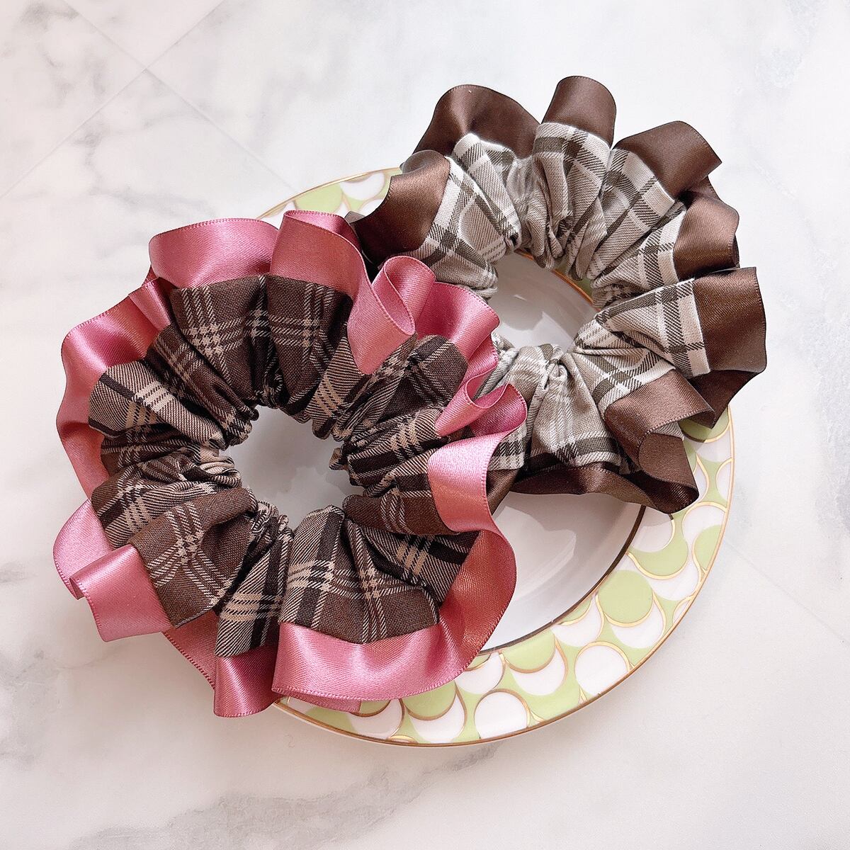 定番のチェック柄の生地とサテンリボンを組み合わせたガーリーかつちょっぴり大人っぽカラーのシュシュです♪