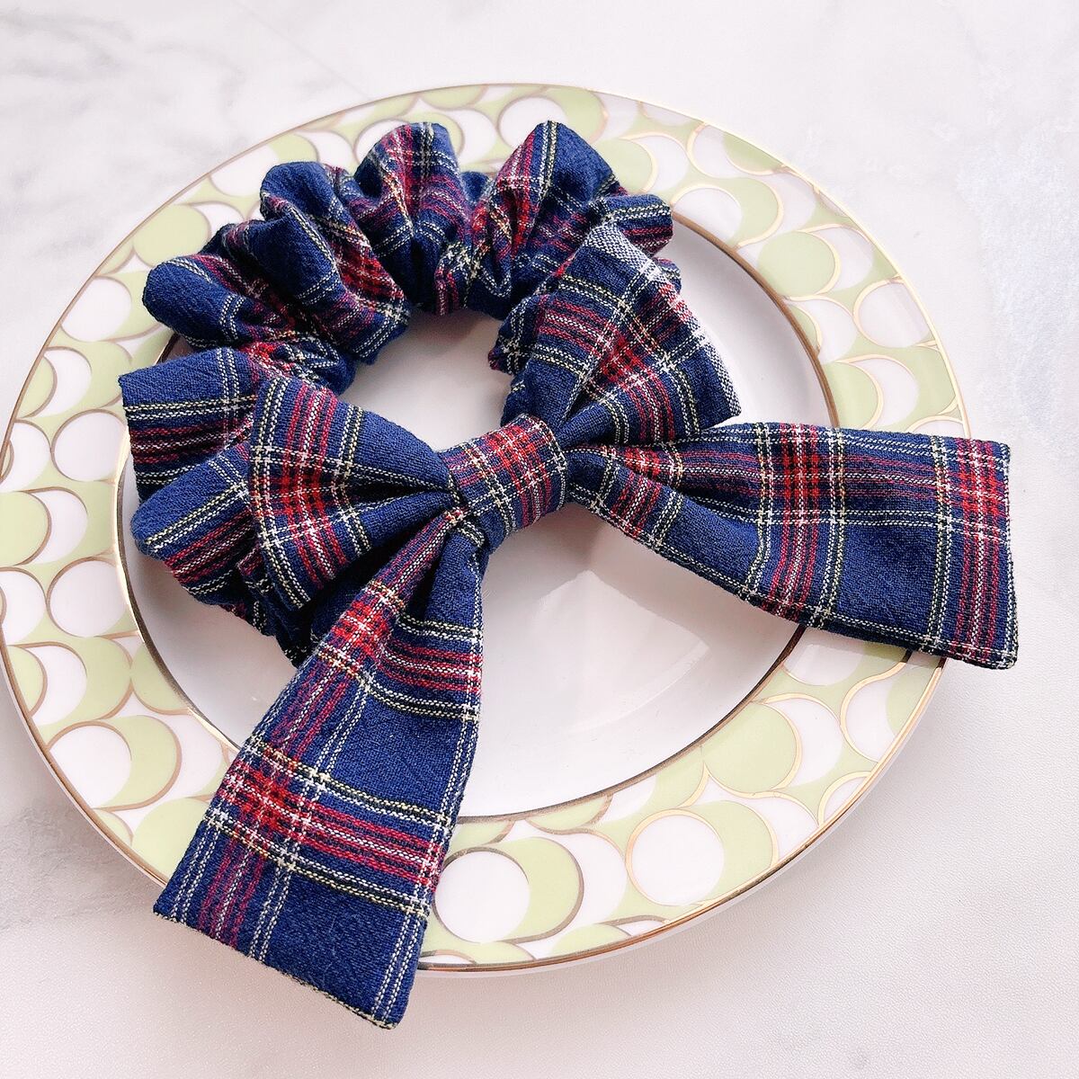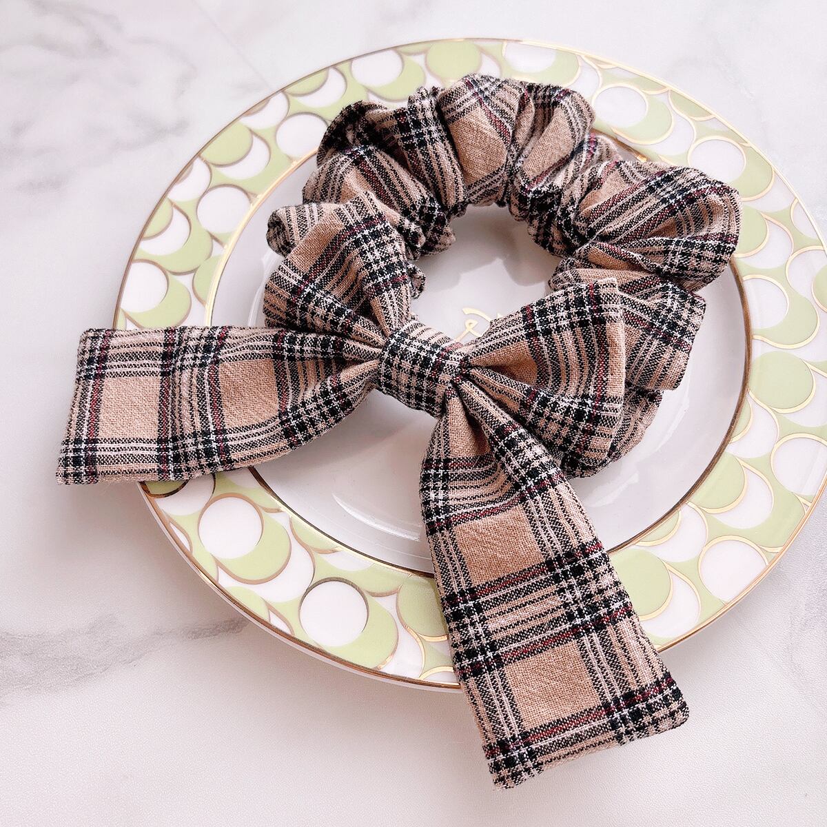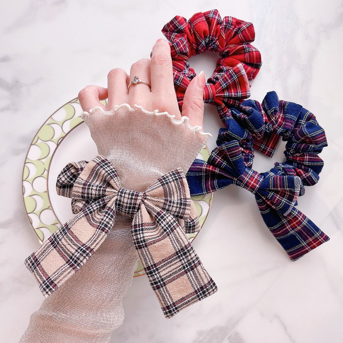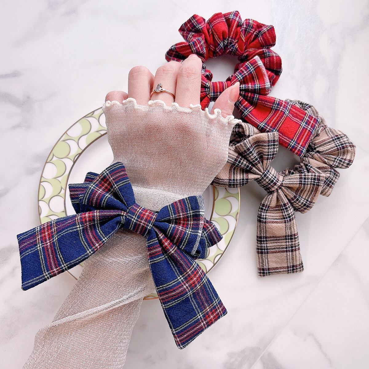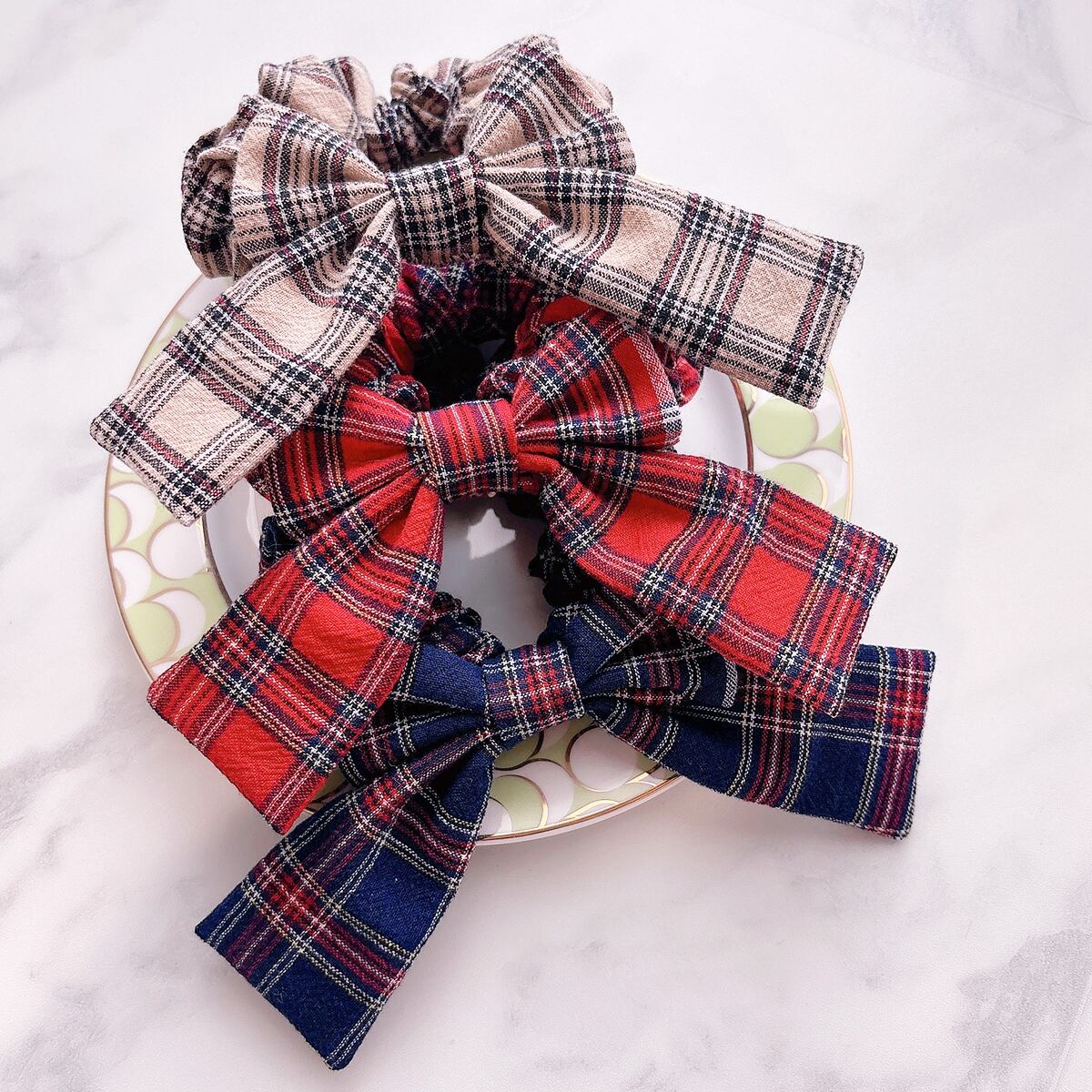 【ATELIER de BOUQUET】タータンチェック柄リボン付きシュシュ(レッド/ベージュ/ネイビー)