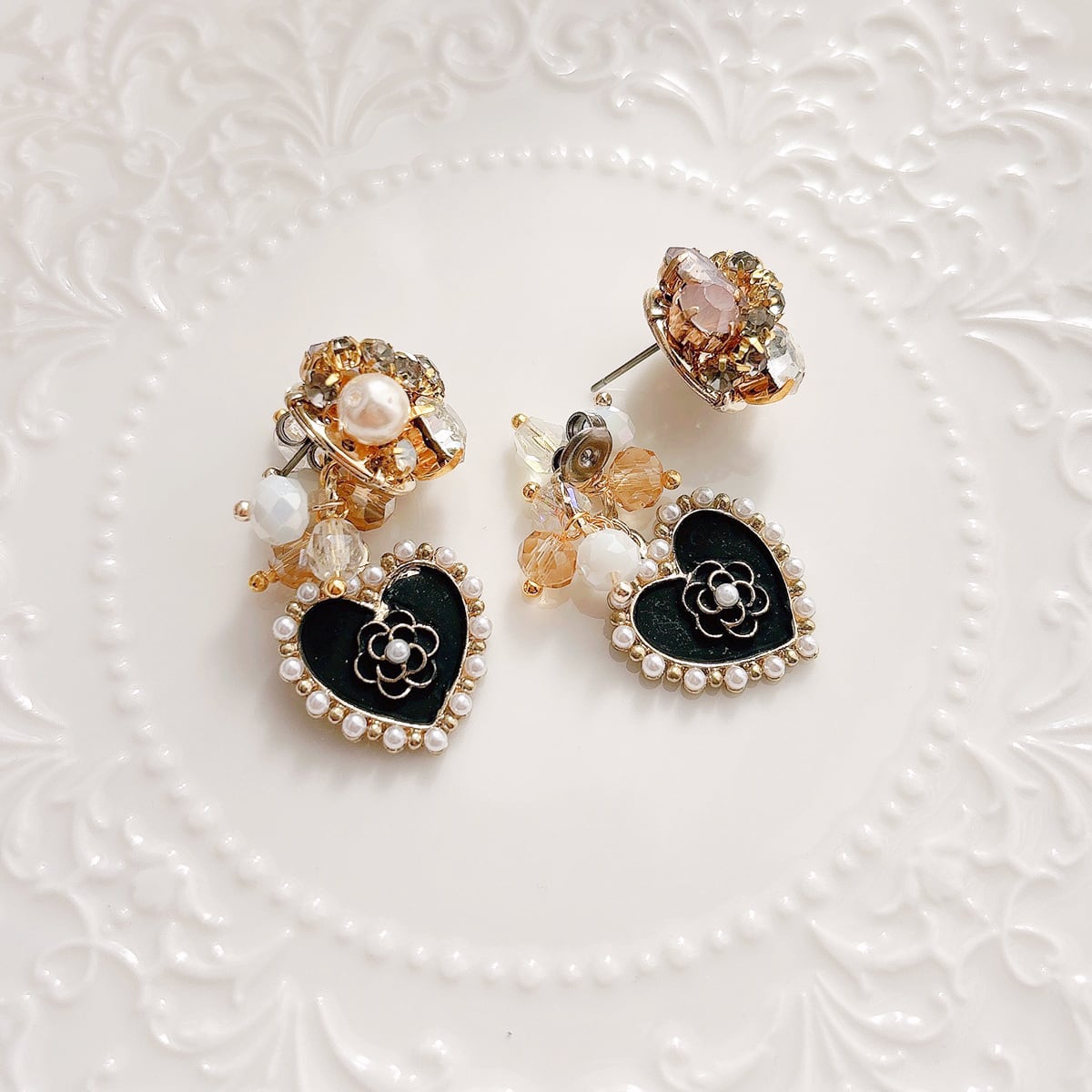シャンパンカラーのビーズやブラックカメリアチャームが耳元で揺れてエレガントな印象に…♡
