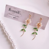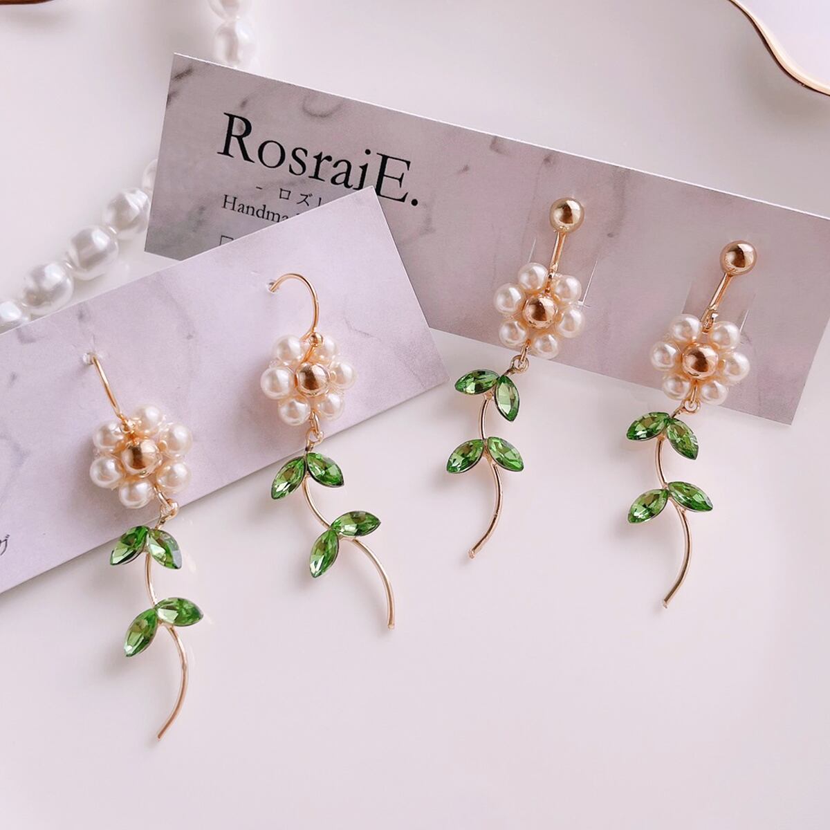 【suzuran】パールフラワー リーフ ピアス/イヤリング(クリア/グリーン)