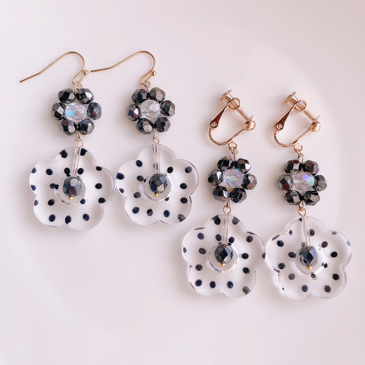 【cotton flower】ドット柄フラワー×フラワービーズ ロング ピアス/イヤリング(ブラッククリア/ミルキーホワイト/クリアパープル)