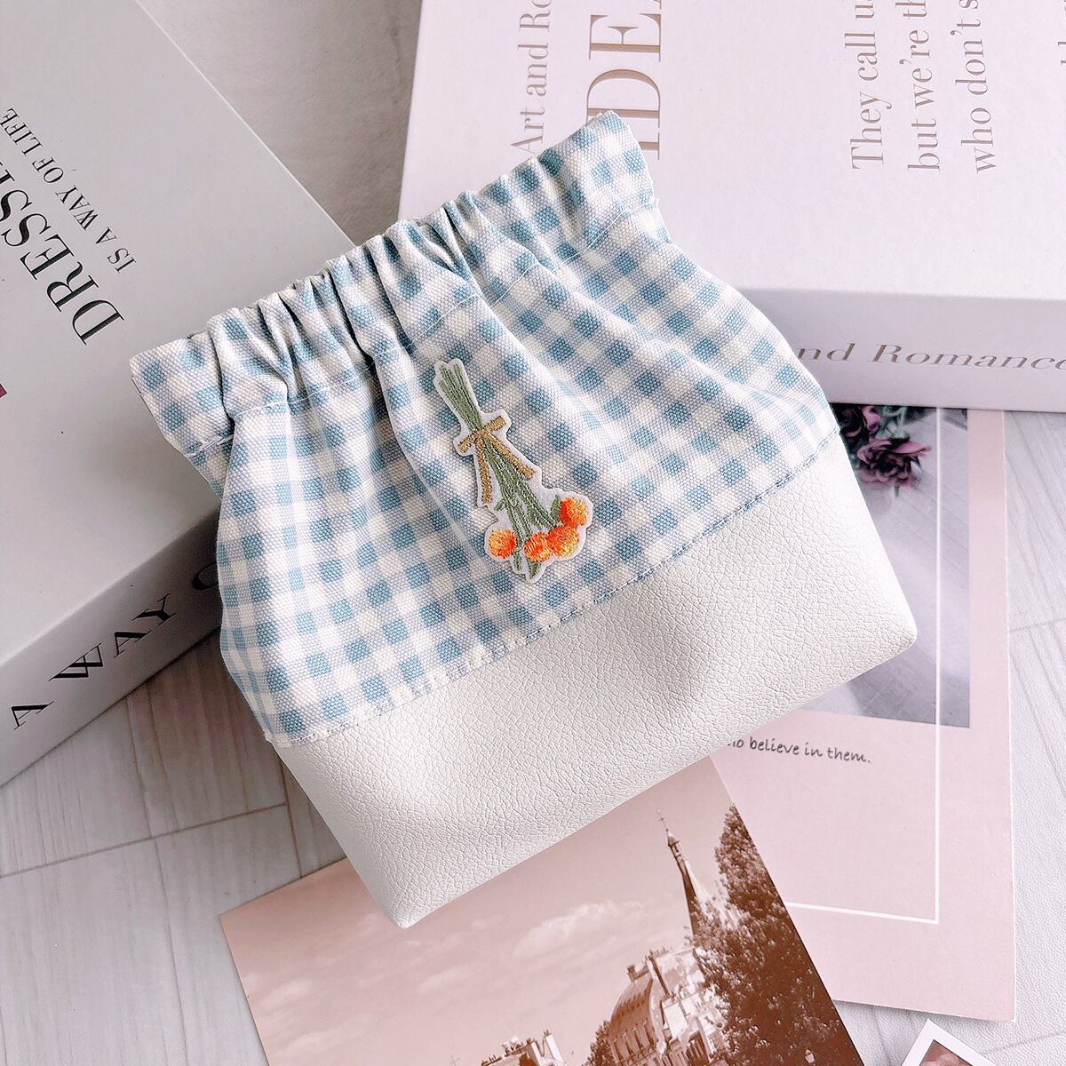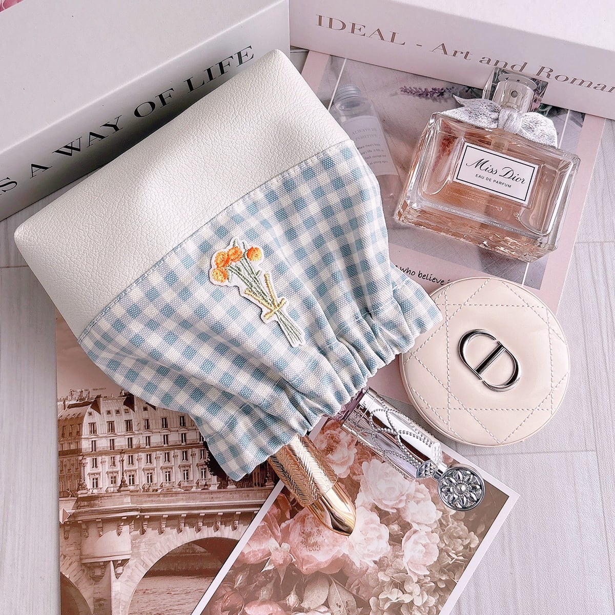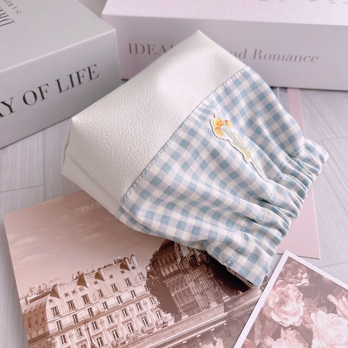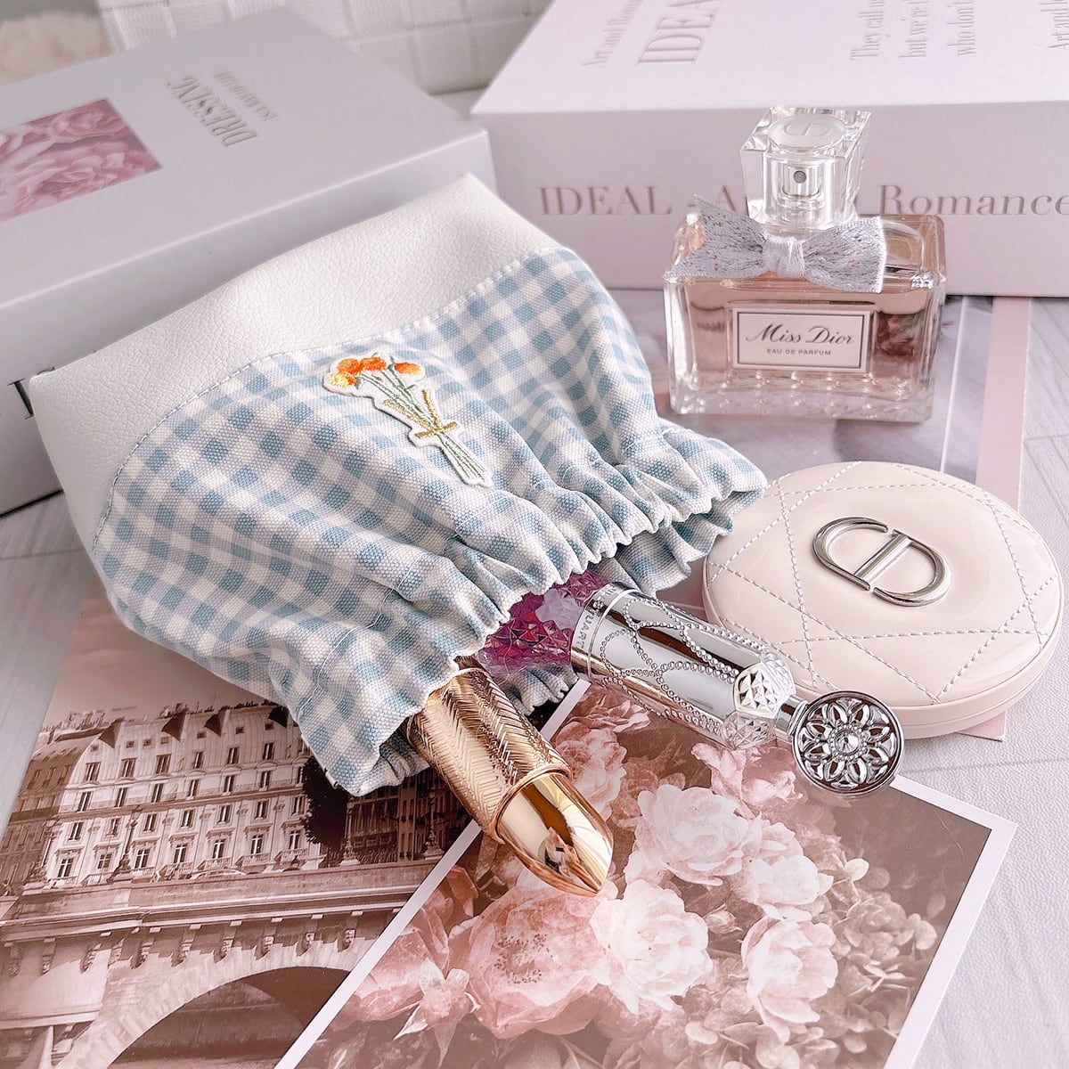 【ATELIER de BOUQUET】フラワーワッペン付きギンガムチェック柄×合皮 ギャザーバネ口ポーチ(大)