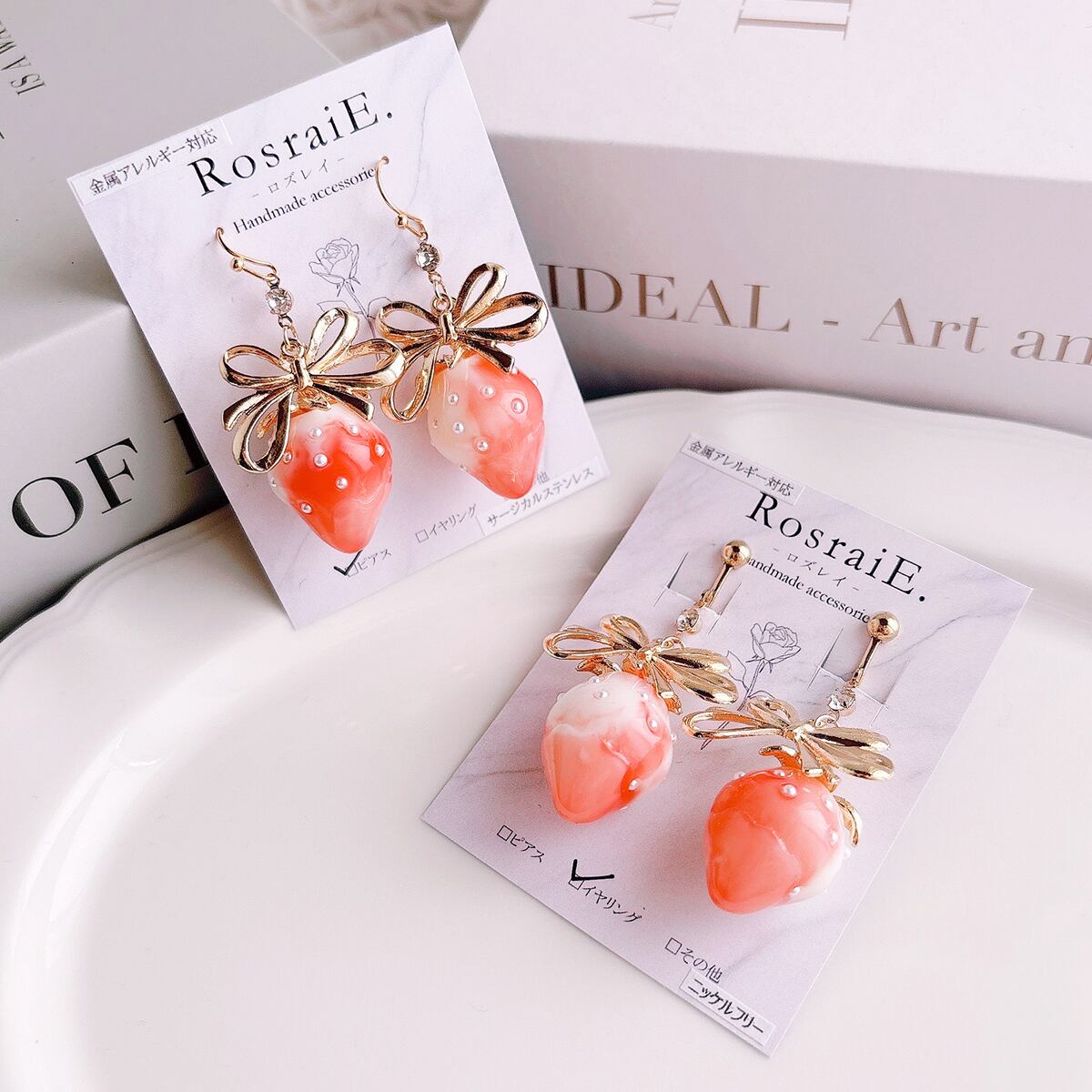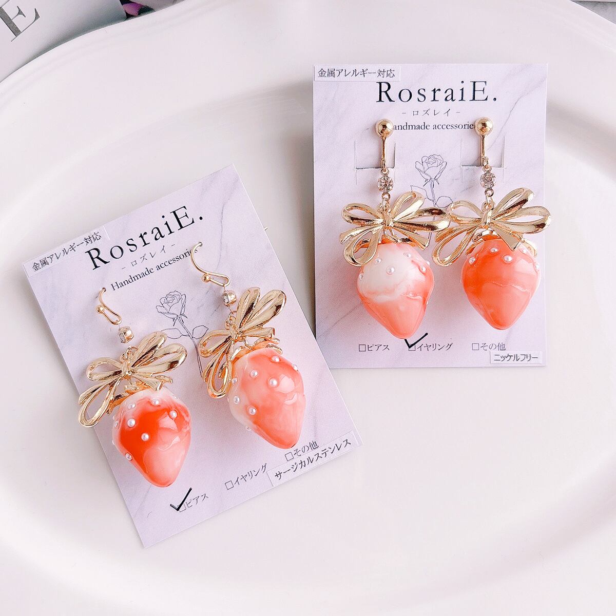 ピンクにホワイトのマーブルがいちごミルク感たっぷりの大きめのストロベリーを使ってシンプルだけどかわいいをぎゅっと詰め込んだアクセサリーを作りました♪