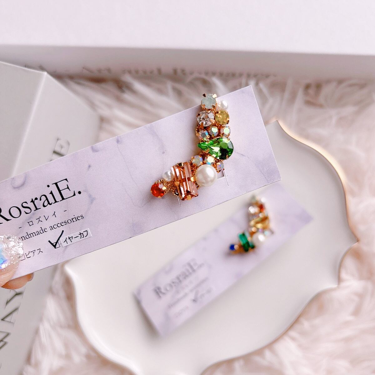 キラキラ輝くカラフルなカラービジューとパールを使った華やかなイヤーカフ