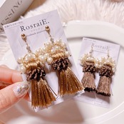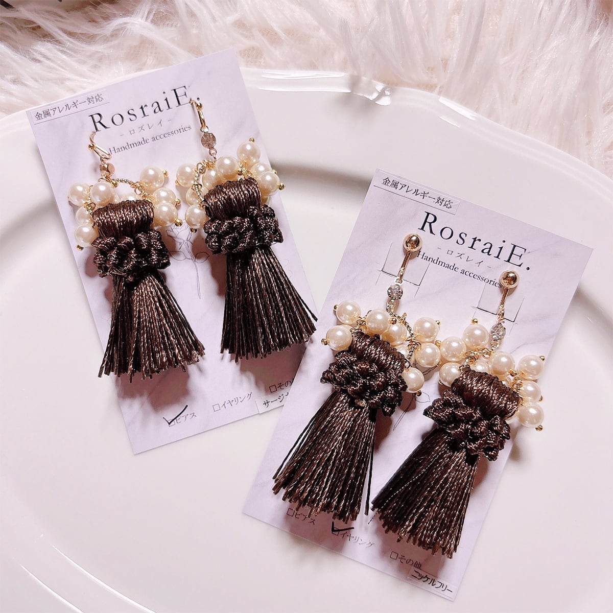 落ち着いたカラーのタッセルと高級感があるクリーム系カラーのパールをたくさん使ってボリューミーで大人っぽいデザインのアクセサリーに仕上げました。