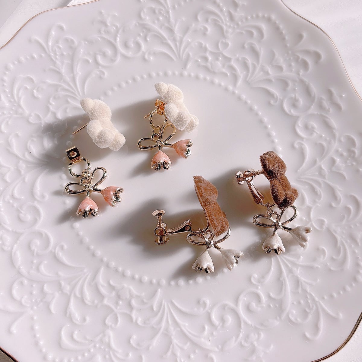 【cotton flower】フロッキーベア フラワーリボン ピアス/イヤリング(アイボリー/ブラウン)
